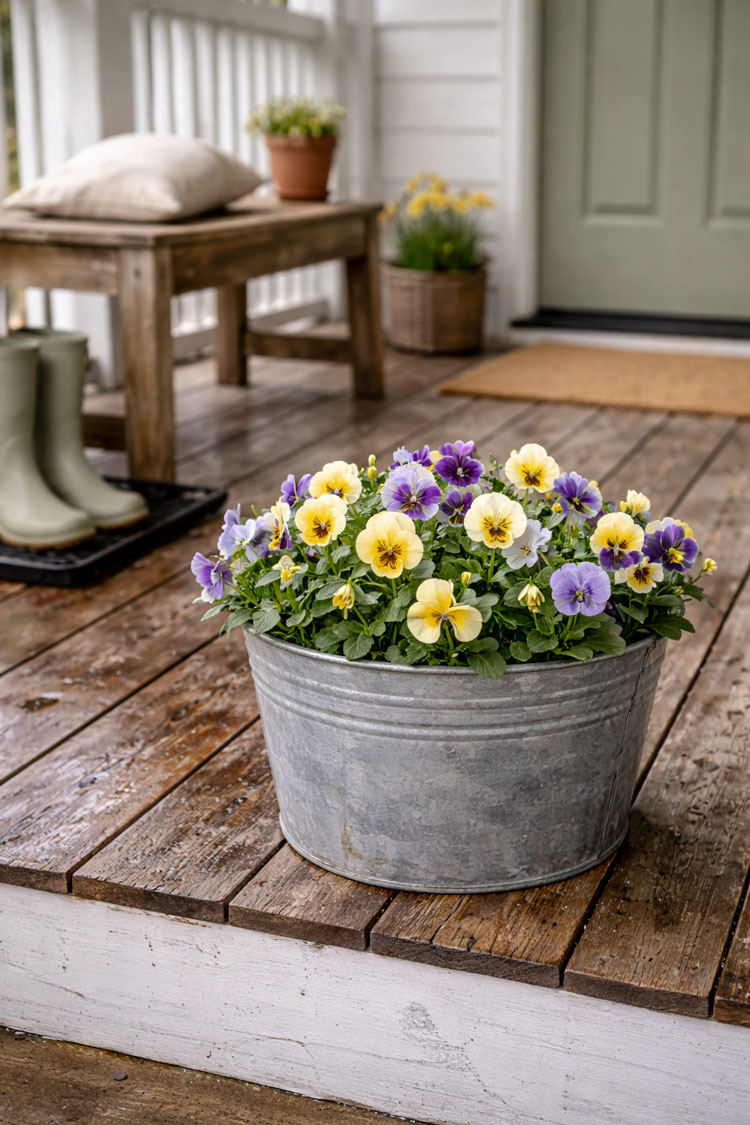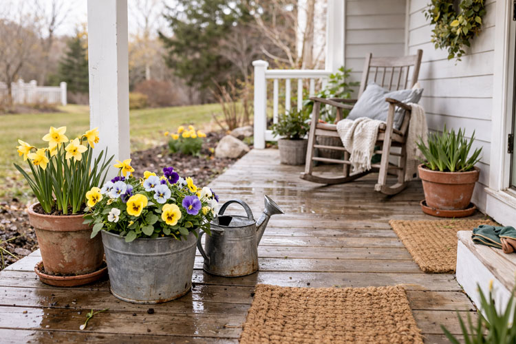 Before you start ordering new furniture or dragging everything out of storage, try this: - Shake out or replace the doormat - Wipe down the front door and railings (winter leaves a film) - Sweep the leaves and dirt from the porch floor - Swap winter pillow covers for something lighter - Add one pot of pansies or violas - Hang a simple spring wreath That’s it. You have a refreshed March porch.