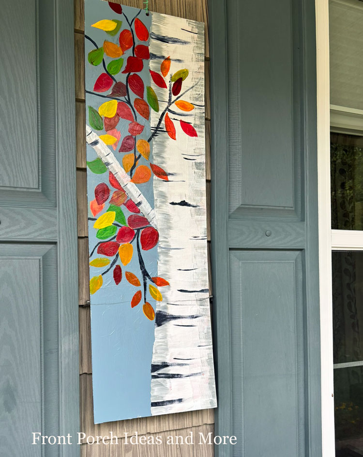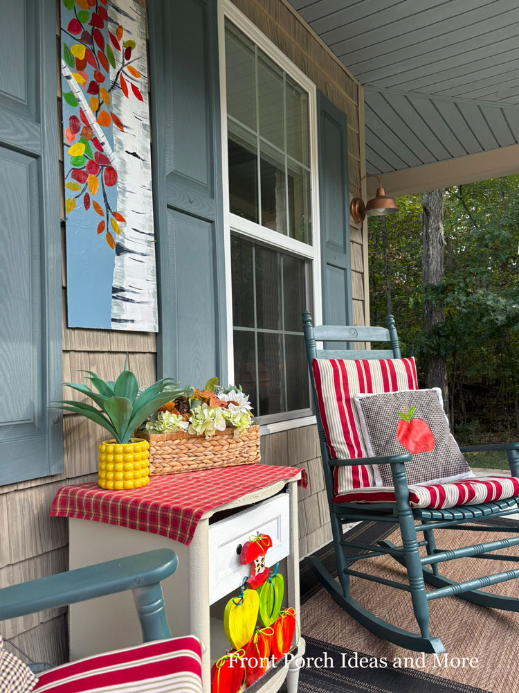 The dark red and white striped rocking chair cushions pair nicely with the blue-and-cream checked pillows, each hand-painted with a bright apple. Tips: We wrapped the cushions with BH & G heavy-weight fabric and pinned it on the back—so simple! For the apples, I used red acrylic paint, starting small so I could adjust the edges easily. Between the chairs, a plaid table cover holds a basket of hydrangeas and fall flowers, along with the wooden apple display Dave made. Our birch painting adds a touch of nature’s calm—wall art is one of our favorite projects. It’s the perfect spot to sip cider, watch leaves fall, and enjoy the crisp, cozy days of fall.