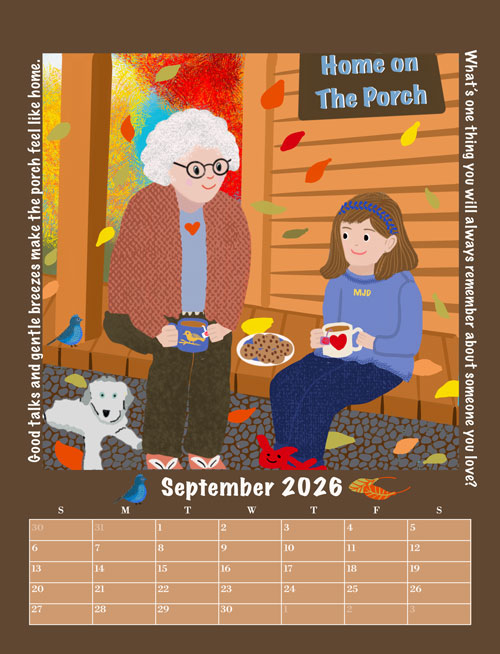 Each month features one of my whimsical paintings of Molly Jo and her family as they move through the seasons — from snowy mornings to summer picnics. A memory that sparks a story in the hearts of young people.