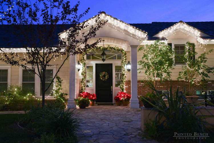 This month’s feature porch celebrates that feeling: warm woods, soft white lights, fresh greens, and just enough color to feel festive.
