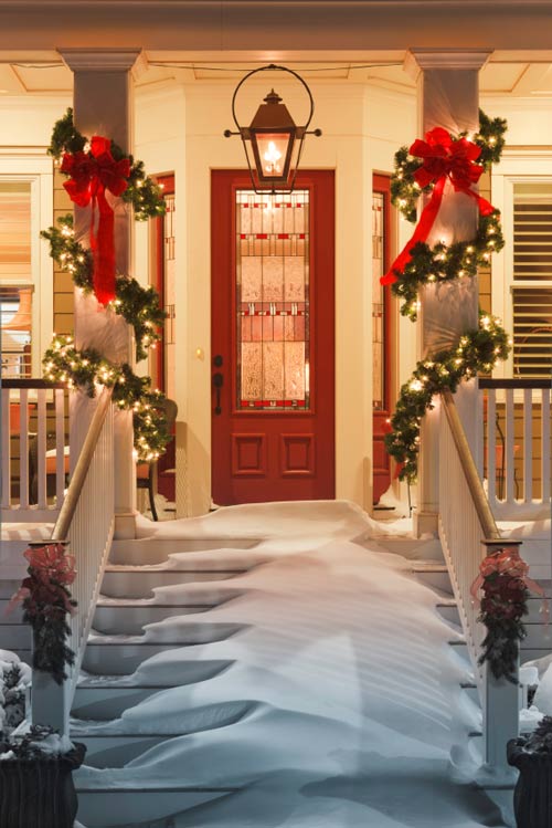 Start with your base: a simple wreath, a small tree, or a garland draped along the railing. Natural elements do most of the work — cedar, pine, winterberry, eucalyptus, and even bare branches create that classic Christmas feel without much fuss.